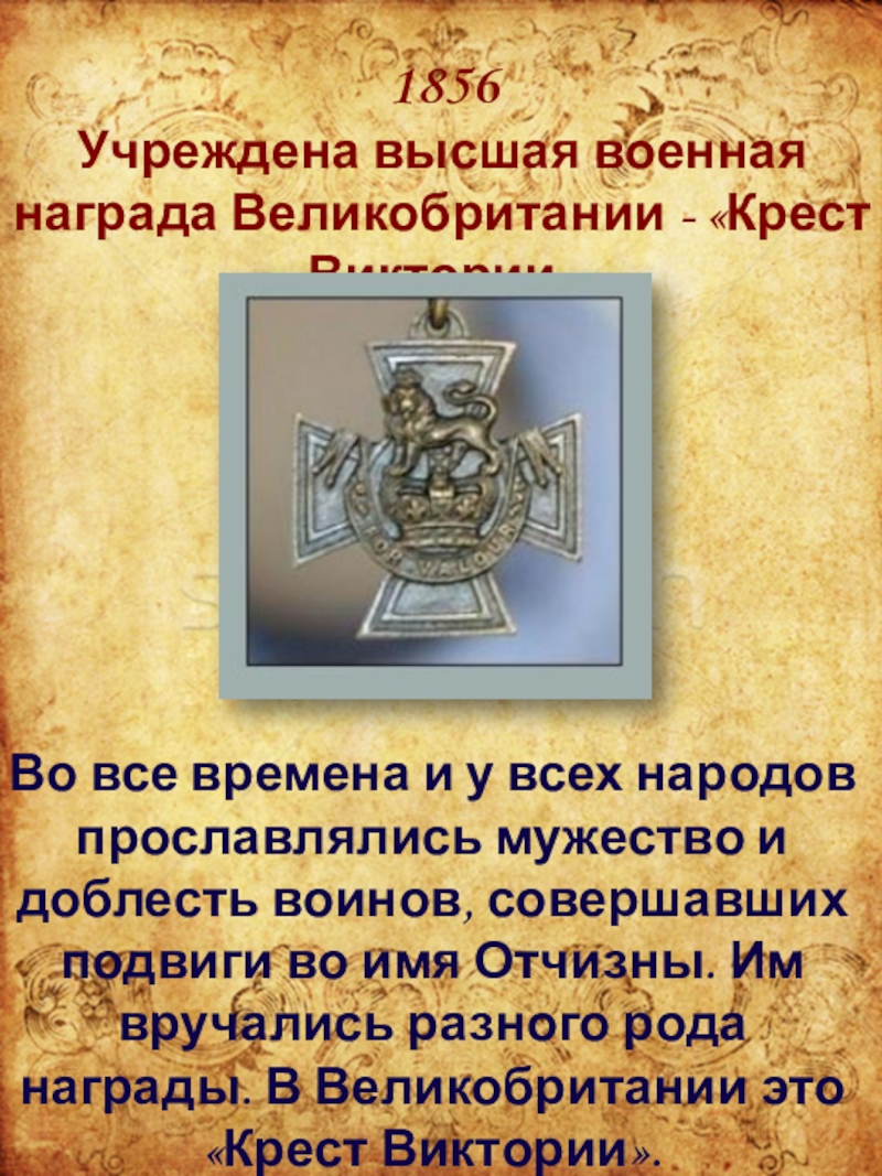 и у всех народов прославлялись мужество и доблесть воинов, совершавших подвиги во имя Отчизны. Им вручались разного рода награды. В Великобритании это «Крест Виктории».
