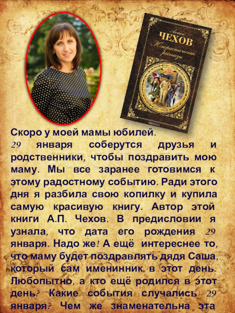 чтобы поздравить мою маму. Мы все заранее готовимся к этому радостному событию. Ради этого дня я разбила свою копилку и купила самую красивую книгу. Автор этой книги А.П. Чехов. В предисловии я узнала, что дата его рождения 29 января. Надо же! А ещё интереснее то, что маму будет поздравлять дядя Саша, который сам именинник в этот день. Любопытно, а кто ещё родился в этот день? Какие события случались 29 января? Чем же знаменательна эта дата? Думаю, это будет интересно знать и маме, и её другу, и было бы важно для писателя А.П.Чехова. Уверена!