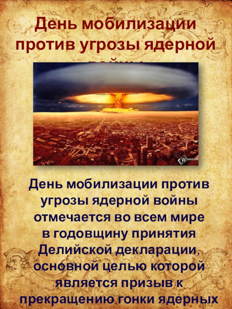 в годовщину принятия Делийской декларации, основной целью которой является призыв к прекращению гонки ядерных вооружений, сокращению и последующей постепенной ликвидации ядерных бомб.
