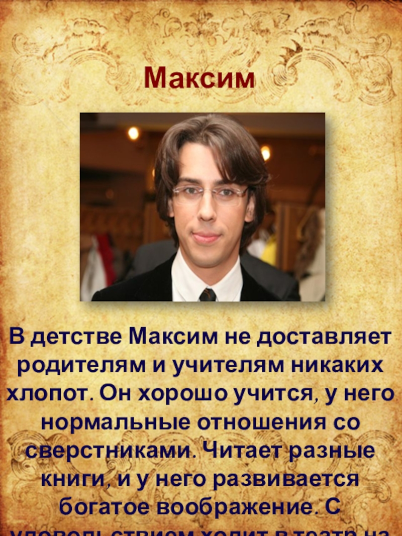 В детстве Максим не доставляет родителям и учителям никаких хлопот. Он