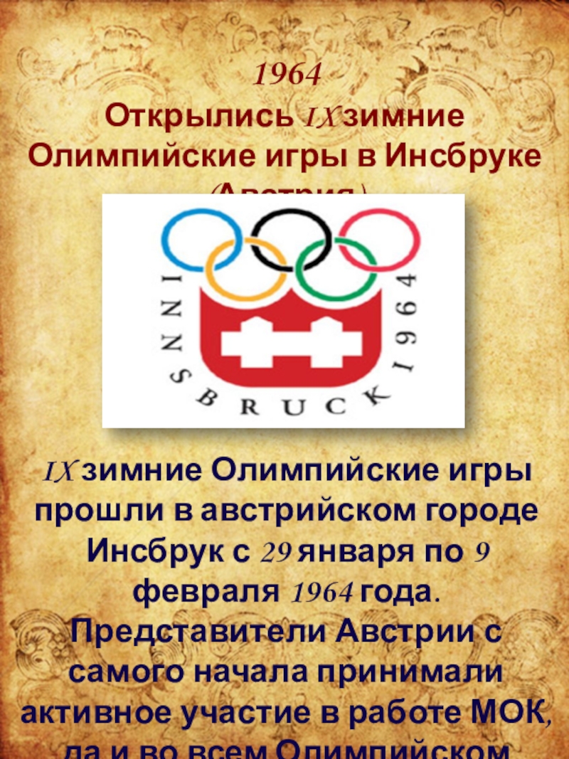 игры прошли в австрийском городе Инсбрук с 29 января по 9 февраля 1964 года. Представители Австрии с самого начала принимали активное участие в работе МОК, да и во всем Олимпийском движении.
