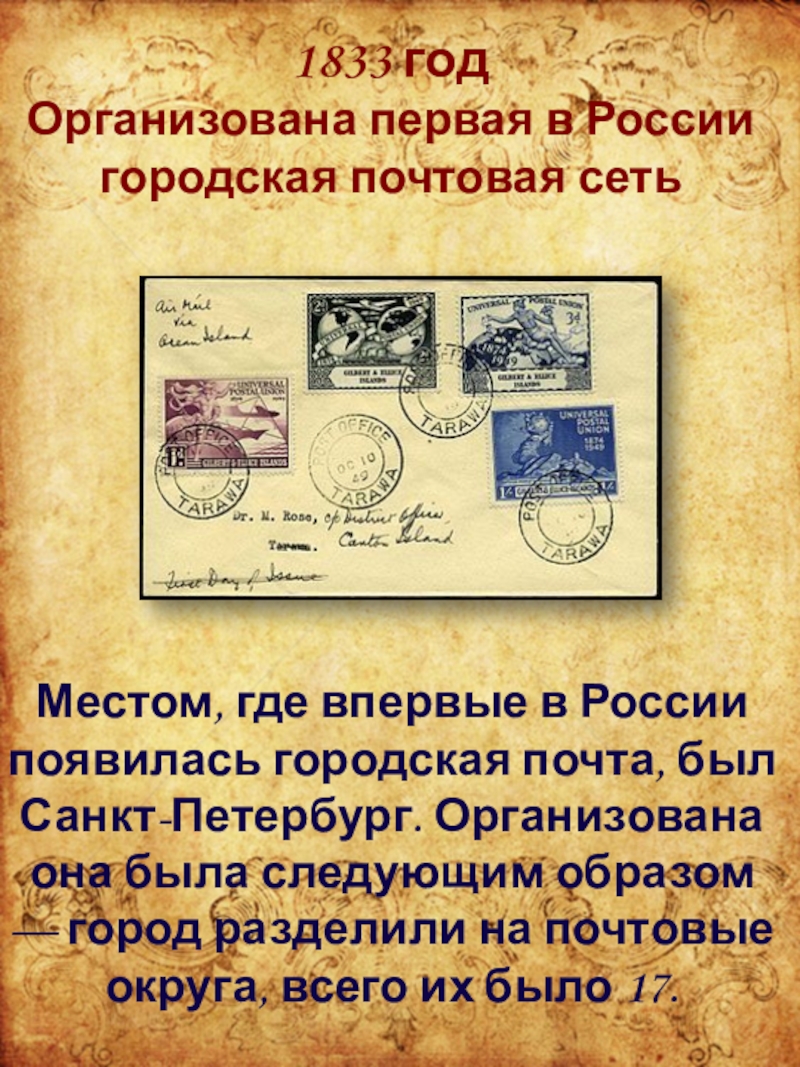 России появилась городская почта, был Санкт-Петербург. Организована она была следующим образом — город разделили на почтовые округа, всего их было 17.