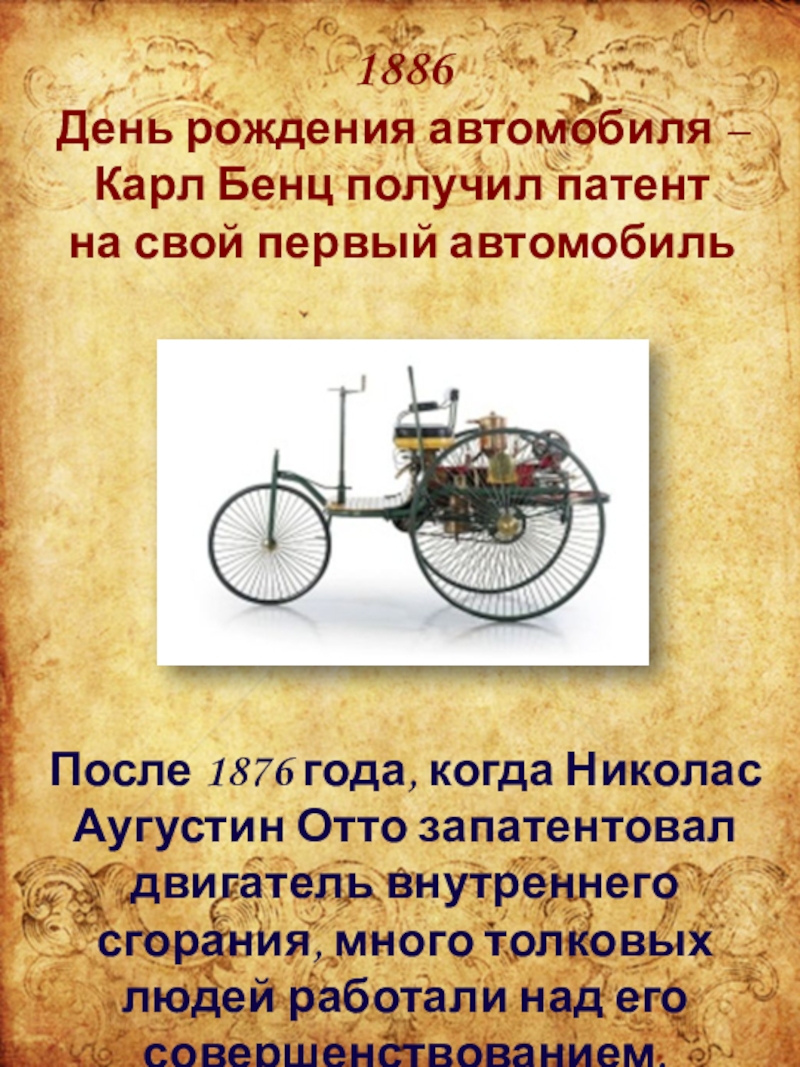 После 1876 года, когда Николас Аугустин Отто запатентовал двигатель внутреннего сгорания, много толковых людей работали над его совершенствованием.