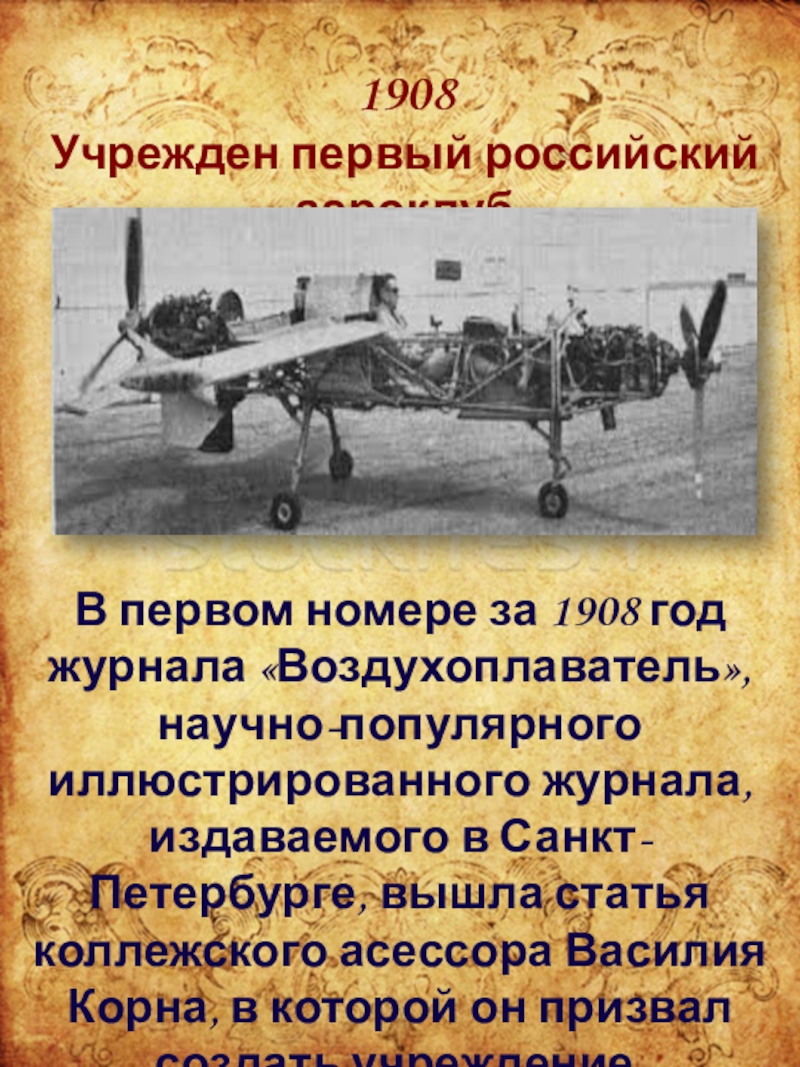 журнала «Воздухоплаватель», научно-популярного иллюстрированного журнала, издаваемого в Санкт-Петербурге, вышла статья коллежского асессора Василия Корна, в которой он призвал создать учреждение, пропагандирующее идеи.