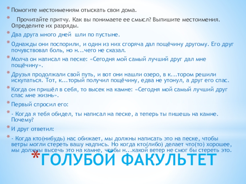 По желанию: написать сказку «В гостях у местоимений» или «Путешествие по стране Местоимений».