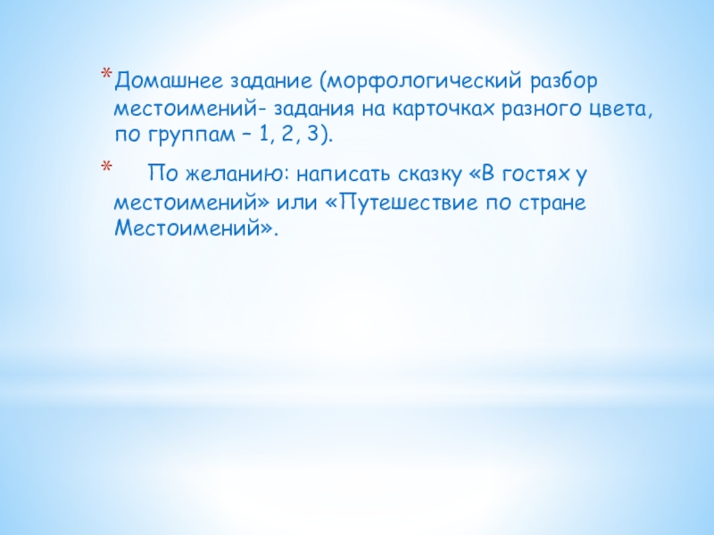 Слайд 16Домашнее задание (морфологический разбор местоимений- задания на карточках разного цвета, по