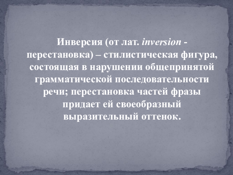 Слайд 7Инверсия (от лат. inversion - перестановка) – стилистическая фигура, состоящая в нарушении общепринятой грамматической