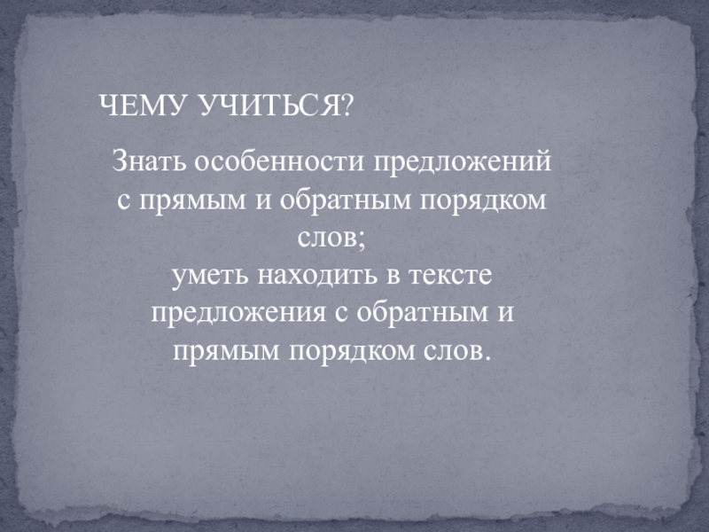 ЧЕМУ УЧИТЬСЯ?Знать особенности предложений с прямым и обратным порядком слов;уметь находить в тексте предложения с обратным и
