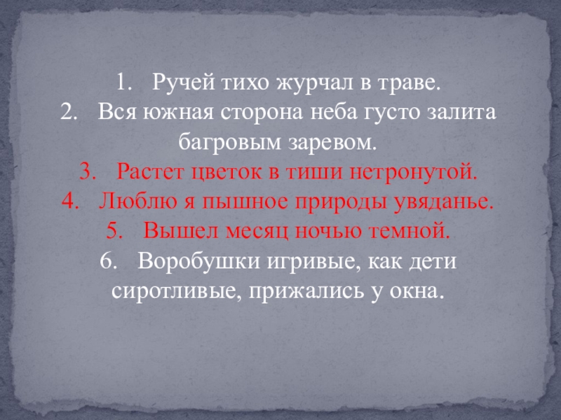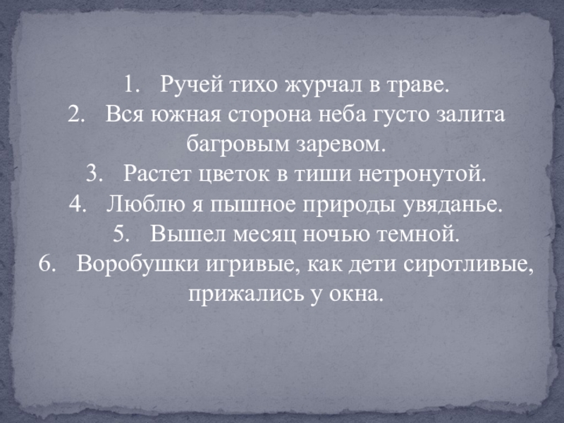 1.   Ручей тихо журчал в траве.2.   Вся южная сторона неба густо залита багровым заревом.3.   Растет цветок в тиши нетронутой.4.   Люблю я