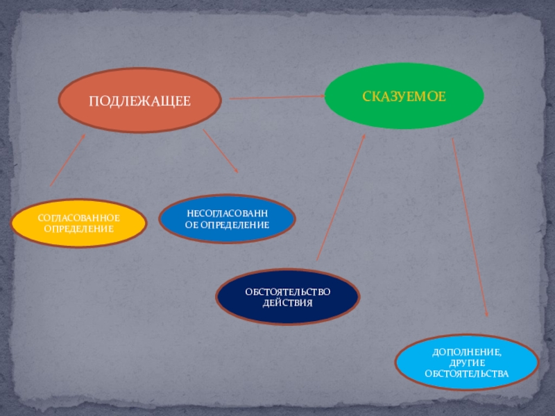 ПОДЛЕЖАЩЕЕСКАЗУЕМОЕСОГЛАСОВАННОЕОПРЕДЕЛЕНИЕНЕСОГЛАСОВАННОЕ ОПРЕДЕЛЕНИЕОБСТОЯТЕЛЬСТВО ДЕЙСТВИЯДОПОЛНЕНИЕ, ДРУГИЕ ОБСТОЯТЕЛЬСТВА
