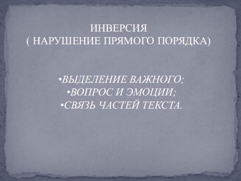 ИНВЕРСИЯ( НАРУШЕНИЕ ПРЯМОГО ПОРЯДКА)ВЫДЕЛЕНИЕ ВАЖНОГО;ВОПРОС И ЭМОЦИИ;СВЯЗЬ ЧАСТЕЙ ТЕКСТА.