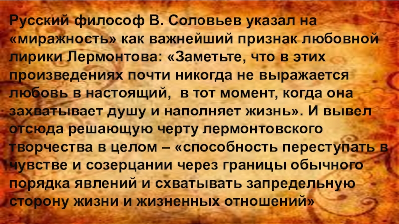 Слайд 2Русский философ В. Соловьев указал на «миражность» как важнейший признак любовной