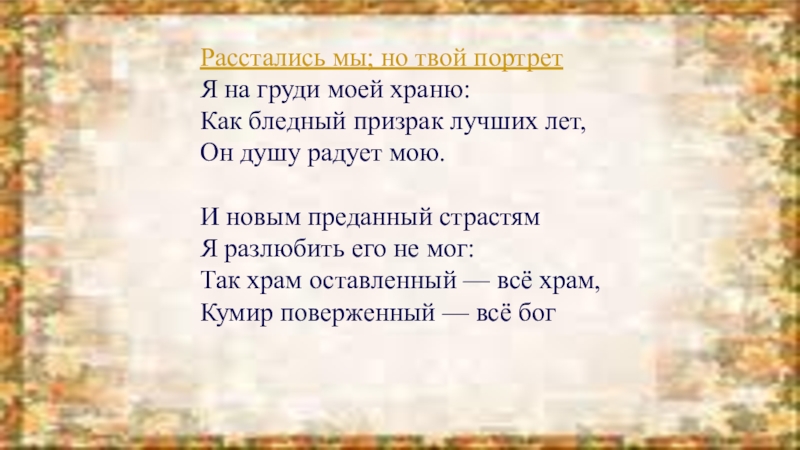 Возлюбленная Лермонтова изменила ему, изменила раньше, когда еще он и не подозревал об этой измене. Предполагается, что Наталья Федоровна намеревалась выйти замуж за некого военного, но брак расстроился. Узнав об измене, Лермонтов не смог уйти от своей любви: она превратилась в муку.