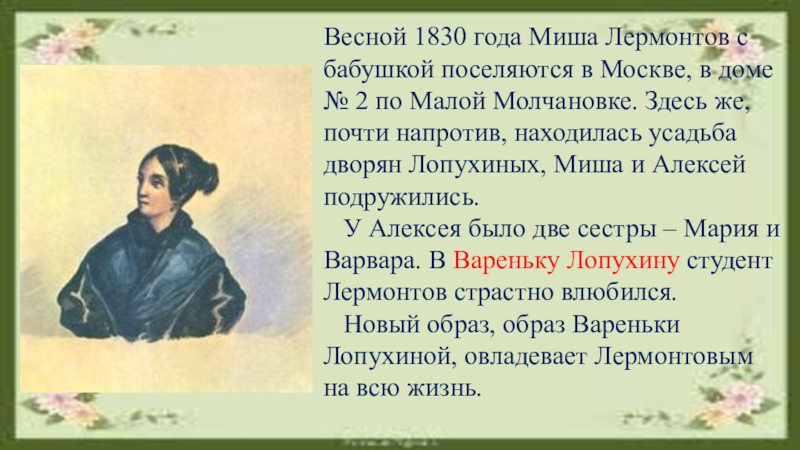 Новый образ, образ Вареньки Лопухиной, овладевает Лермонтовым на всю жизнь.