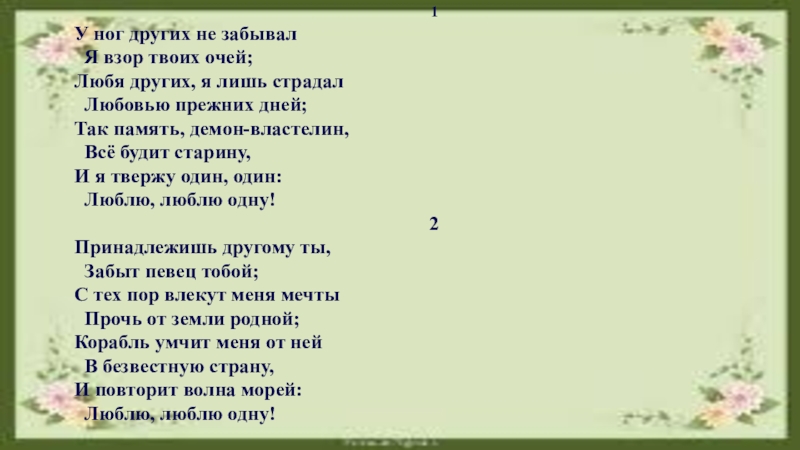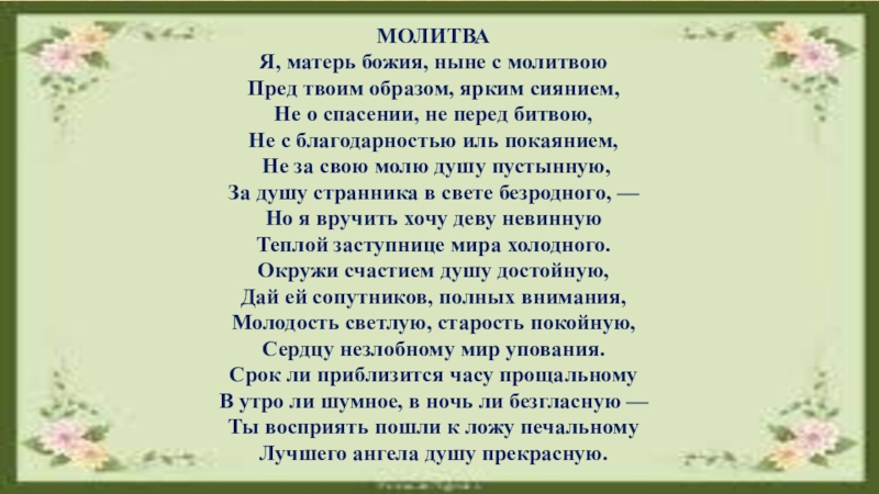 лирики Лермонтова: «Заметьте, что в этих произведениях почти никогда не выражается любовь в настоящий, в тот момент, когда она захватывает душу и наполняет жизнь». И вывел отсюда решающую черту лермонтовского творчества в целом – «способность переступать в чувстве и созерцании через границы обычного порядка явлений и схватывать запредельную сторону жизни и жизненных отношений»