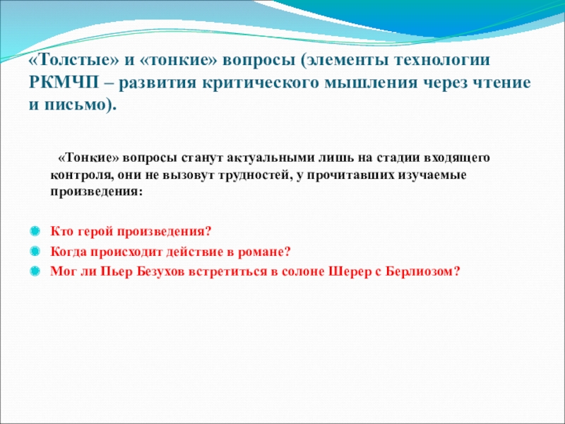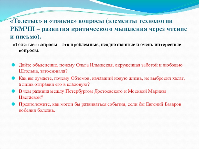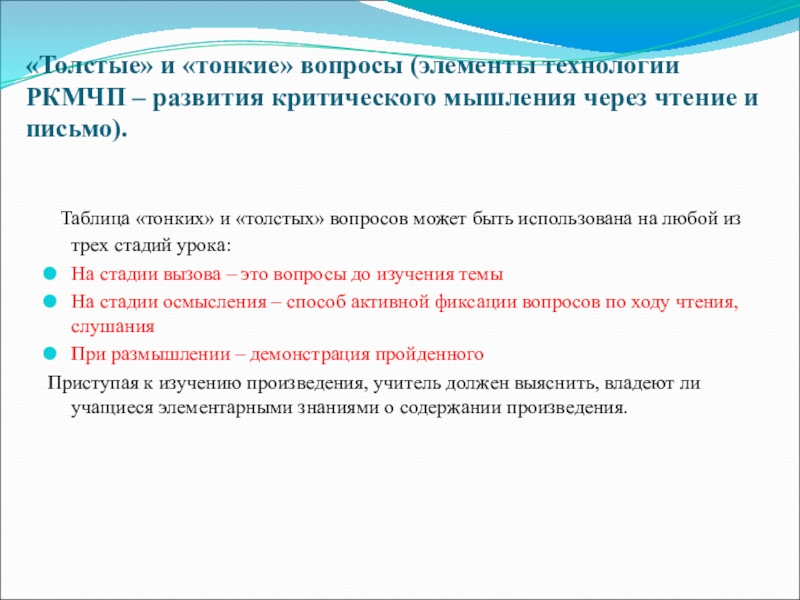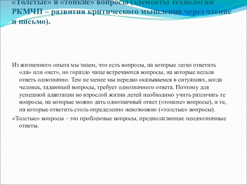 Слайд 20«Толстые» и «тонкие» вопросы (элементы технологии РКМЧП – развития критического мышления