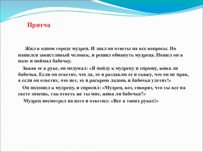 он ответы на все вопросы. Но нашелся завистливый человек, и решил обмануть мудреца. Пошел он в поле и поймал бабочку.