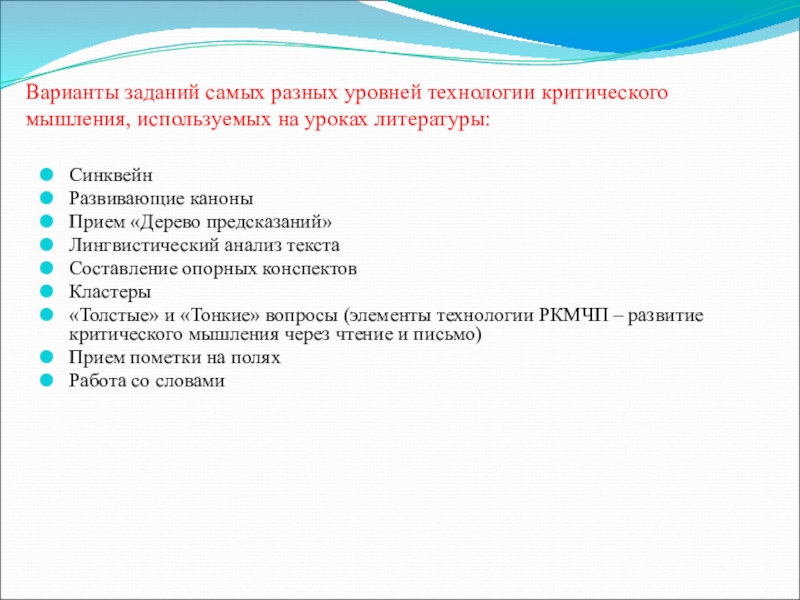 Слайд 3Варианты заданий самых разных уровней технологии критического мышления, используемых на уроках