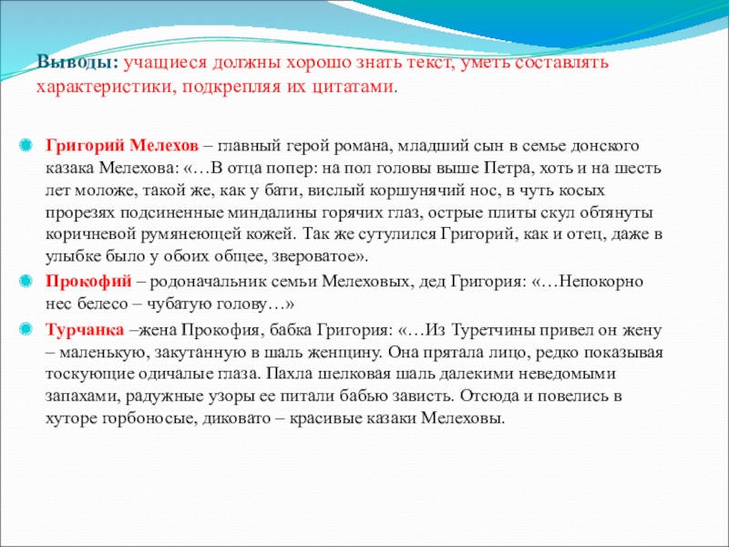 Слайд 10Выводы: учащиеся должны хорошо знать текст, уметь составлять характеристики, подкрепляя их