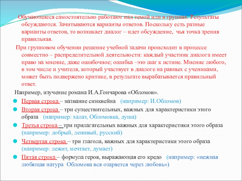 Пятая строка – формула героя, выражающая его кредо (например: «нежная любящая натура Обломова вся озаряется через любовь»)