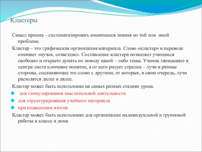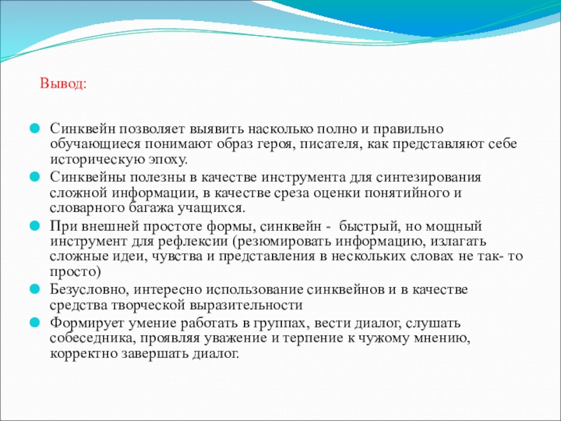 Синквейны полезны в качестве инструмента для синтезирования сложной информации, в качестве среза оценки понятийного и словарного багажа учащихся.