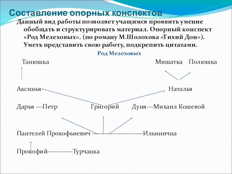 обобщать и структурировать материал. Опорный конспект «Род Мелеховых». (по роману М.Шолохова «Тихий Дон»). Уметь представить свою работу, подкрепить цитатами.