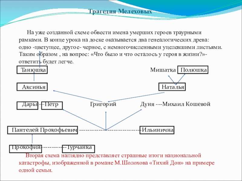 Вторая схема наглядно представляет страшные итоги национальной катастрофы, изображенной в романе М.Шолохова «Тихий Дон» на примере одной семьи.