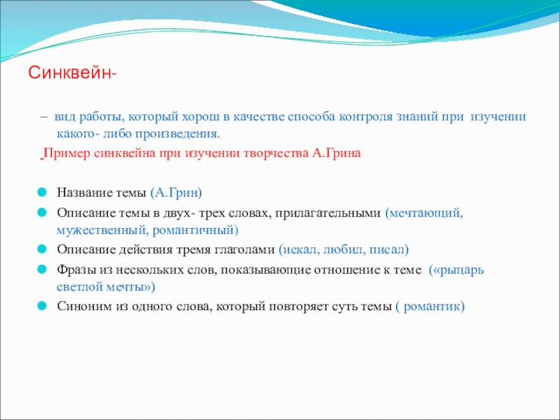 Пример синквейна при изучении творчества А.Грина