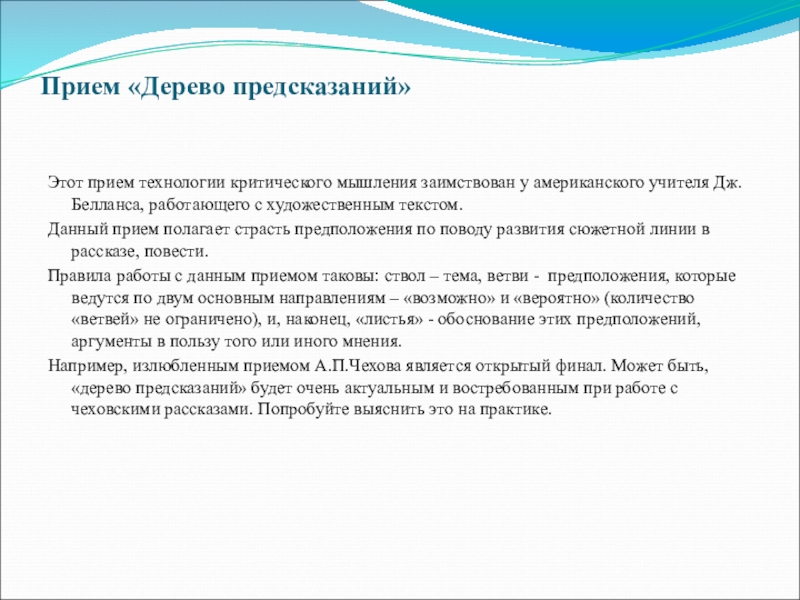 Например, излюбленным приемом А.П.Чехова является открытый финал. Может быть, «дерево предсказаний» будет очень актуальным и востребованным при работе с чеховскими рассказами. Попробуйте выяснить это на практике.