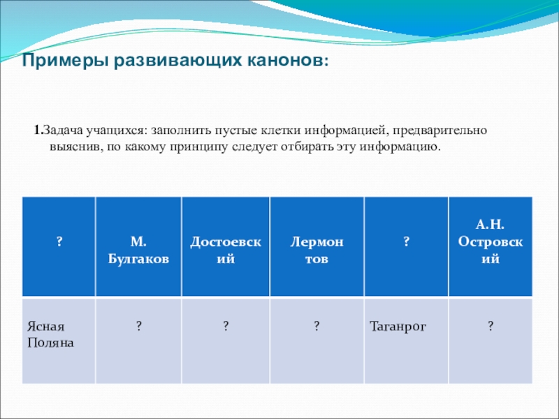задания, целенаправленно развивающего те или иные интеллектуальные качества, необходимые для творческой работы. РК – это упражнение, элемент интеллектуальной игры или задача, состоящая из шести организованных элементов, связанных между собой некоторыми логическими, ассоциативными или другими связями. Развивающий канон может иметь различные формы: табличную, линейную, кольцевую, ступенчатую. Исследования РК показали, что их можно использовать в учебном процессе для оживления творческого отношения к самым разным предметам.