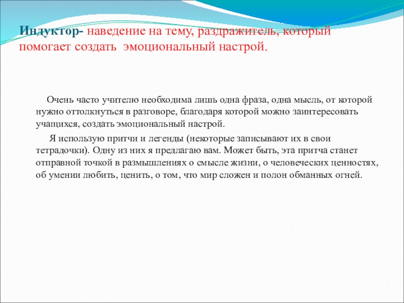 Слайд 29Индуктор- наведение на тему, раздражитель, который помогает создать эмоциональный настрой.