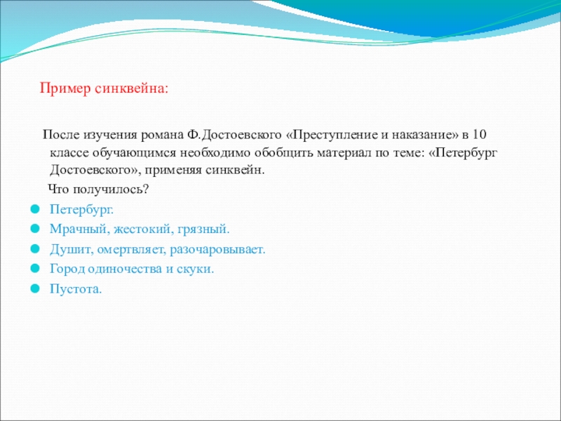 классе обучающимся необходимо обобщить материал по теме: «Петербург Достоевского», применяя синквейн.