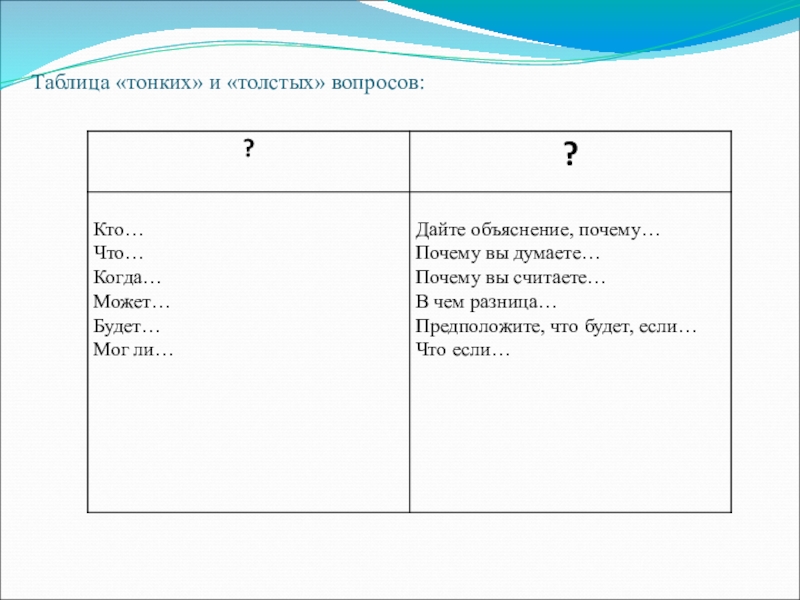 Слайд 21Таблица «тонких» и «толстых» вопросов: