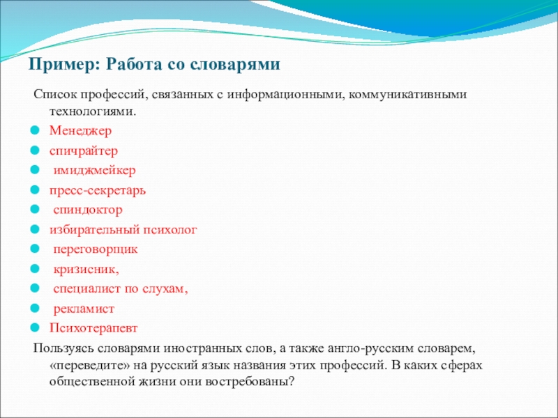 Пользуясь словарями иностранных слов, а также англо-русским словарем, «переведите» на русский язык названия этих профессий. В каких сферах общественной жизни они востребованы?