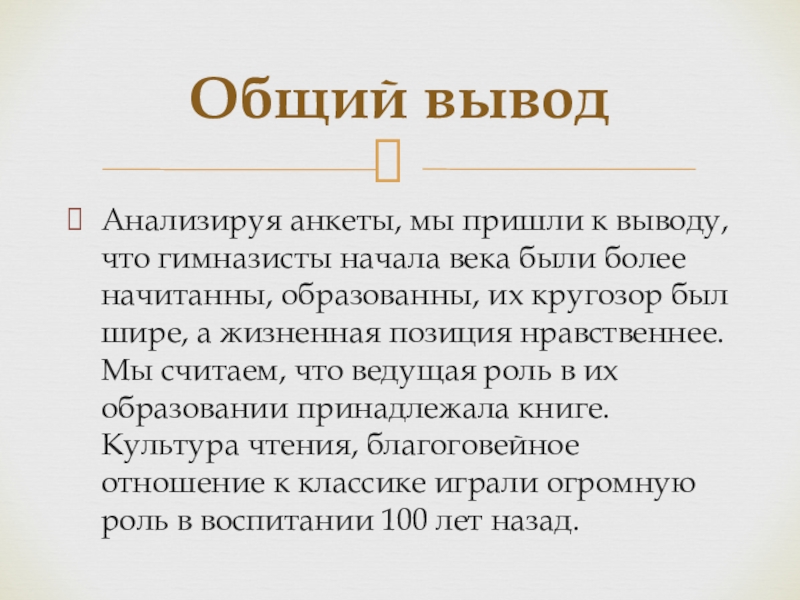века были более начитанны, образованны, их кругозор был шире, а жизненная позиция нравственнее. Мы считаем, что ведущая роль в их образовании принадлежала книге. Культура чтения, благоговейное отношение к классике играли огромную роль в воспитании 100 лет назад.