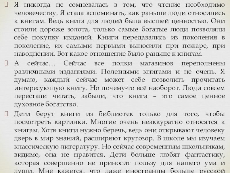 А сейчас… Сейчас все полки магазинов переполнены различными изданиями. Полезными книгами и не очень. Я думаю, каждый сейчас может себе позволить прочитать интересующую книгу. Но почему-то всё наоборот. Люди совсем перестали читать, забыли, что книга – это самое ценное духовное богатство.
