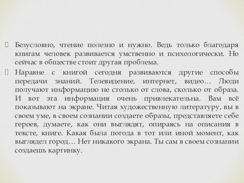 Наравне с книгой сегодня развиваются другие способы передачи знаний. Телевидение, интернет, видео… Люди получают информацию не столько от слова, сколько от образа. И вот эта информация очень привлекательна. Вам всё показывают на экране. Читая художественную литературу, вы в своем уме, в своем сознании создаете образы, представляете себе героев, думаете, как они выглядят, опираясь на описания в тексте, книге. Какая была погода в тот или иной момент, как выглядел город… Нет никакого экрана. Ты сам в своем сознании создаешь картинку.
