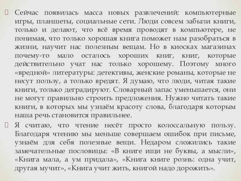совсем забыли книги, только и делают, что всё время проводят в компьютере, не понимая, что только хорошая книга поможет нам разобраться в жизни, научит нас полезным вещам. Но в киосках магазинах почему-то мало осталось хороших книг, книг, которые действительно учат нас только хорошему. Поэтому много «вредной» литературы: детективы, женские романы, которые не несут пользу, а только вредят. Я думаю, что люди, читая такие книги, только деградируют. Словарный запас уменьшается, они не могут правильно строить предложения. Нужно читать такие книги, в которых мы узнаём красоту слова, благодаря которым наша речь становится правильнее.