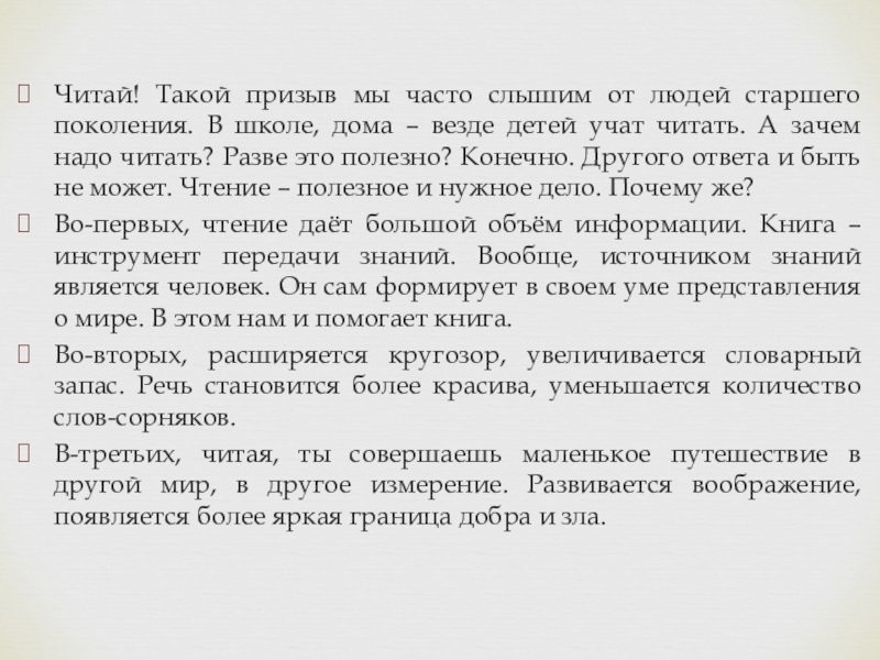Во-первых, чтение даёт большой объём информации. Книга – инструмент передачи знаний. Вообще, источником знаний является человек. Он сам формирует в своем уме представления о мире. В этом нам и помогает книга.