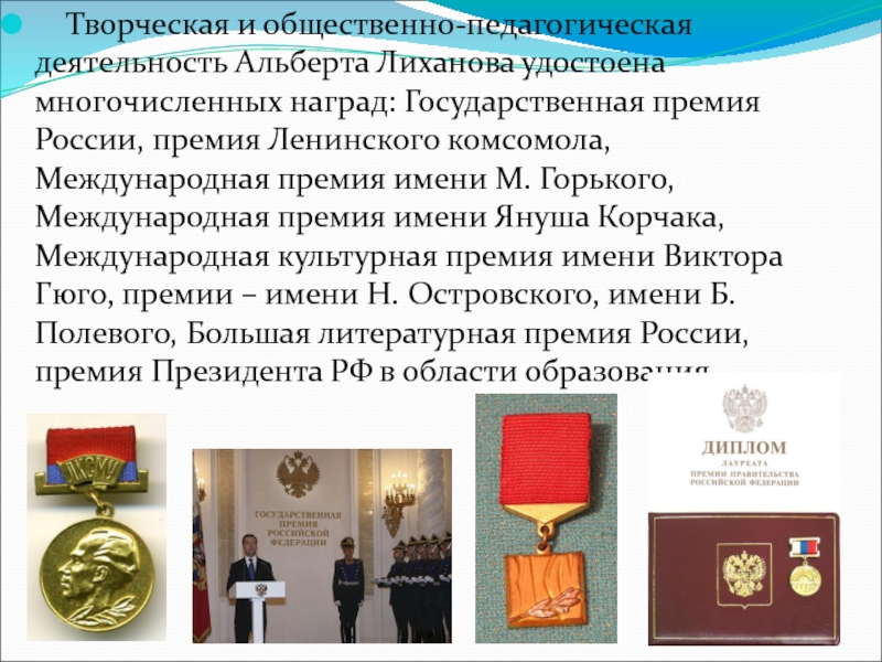 Слайд 13 Творческая и общественно-педагогическая деятельность Альберта Лиханова удостоена многочисленных наград: Государственная премия