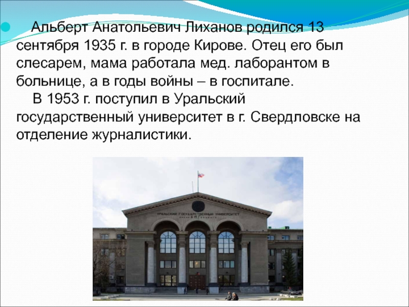 Слайд 3 Альберт Анатольевич Лиханов родился 13 сентября 1935 г. в городе Кирове.