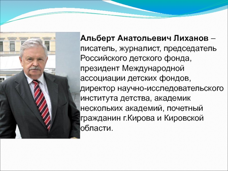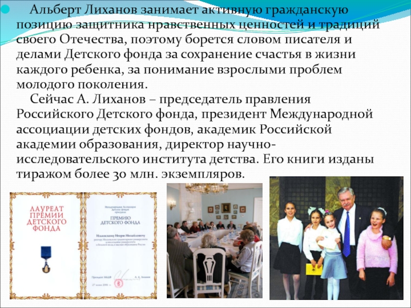 Слайд 2Альберт Анатольевич Лиханов – писатель, журналист, председатель Российского детского фонда, президент