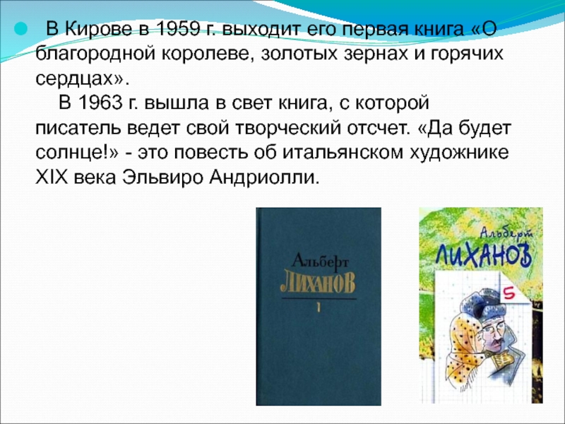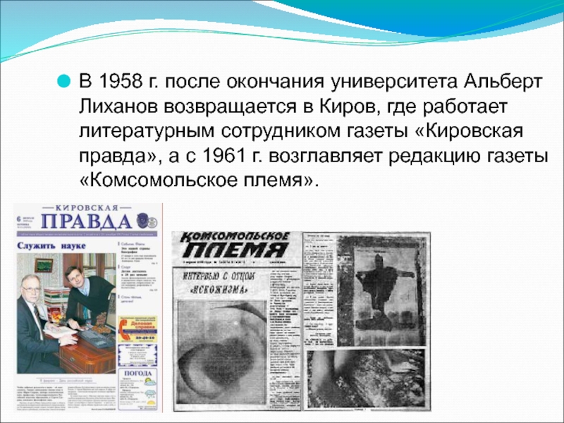 Слайд 4В 1958 г. после окончания университета Альберт Лиханов возвращается в Киров,
