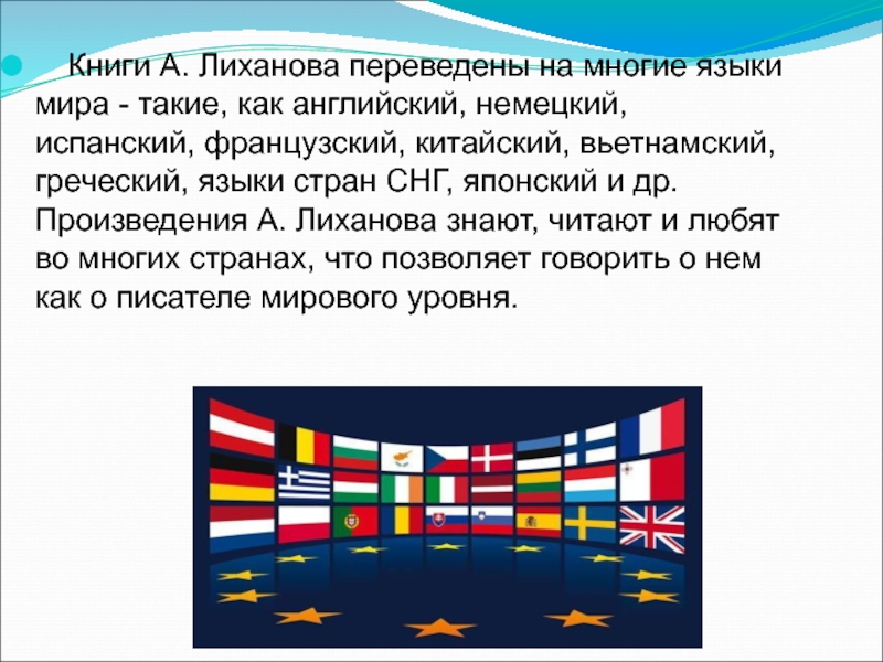 Слайд 15 Книги А. Лиханова переведены на многие языки мира - такие, как