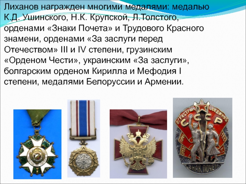 Слайд 14Лиханов награжден многими медалями: медалью К.Д. Ушинского, Н.К. Крупской, Л.Толстого, орденами