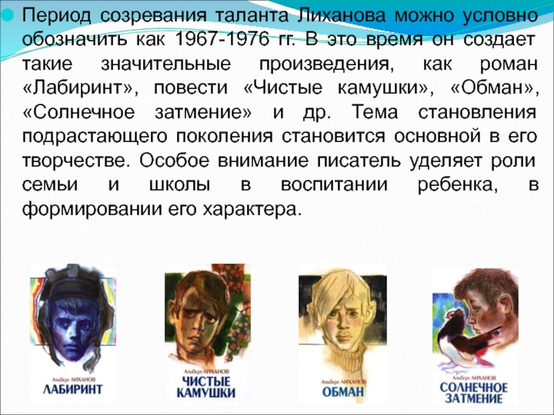 Слайд 7Период созревания таланта Лиханова можно условно обозначить как 1967-1976 гг. В