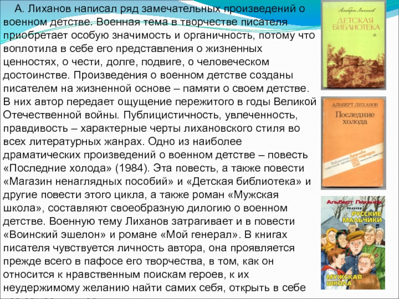 в творчестве писателя приобретает особую значимость и органичность, потому что воплотила в себе его представления о жизненных ценностях, о чести, долге, подвиге, о человеческом достоинстве. Произведения о военном детстве созданы писателем на жизненной основе – памяти о своем детстве. В них автор передает ощущение пережитого в годы Великой Отечественной войны. Публицистичность, увлеченность, правдивость – характерные черты лихановского стиля во всех литературных жанрах. Одно из наиболее драматических произведений о военном детстве – повесть «Последние холода» (1984). Эта повесть, а также повести «Магазин ненаглядных пособий» и «Детская библиотека» и другие повести этого цикла, а также роман «Мужская школа», составляют своеобразную дилогию о военном детстве. Военную тему Лиханов затрагивает и в повести «Воинский эшелон» и романе «Мой генерал». В книгах писателя чувствуется личность автора, она проявляется прежде всего в пафосе его творчества, в том, как он относится к нравственным поискам героев, к их неудержимому желанию найти самих себя, открыть в себе все самое лучшее.