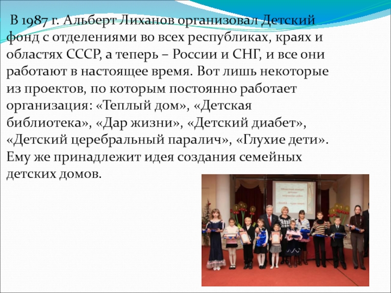 Слайд 11 В 1987 г. Альберт Лиханов организовал Детский фонд с отделениями во