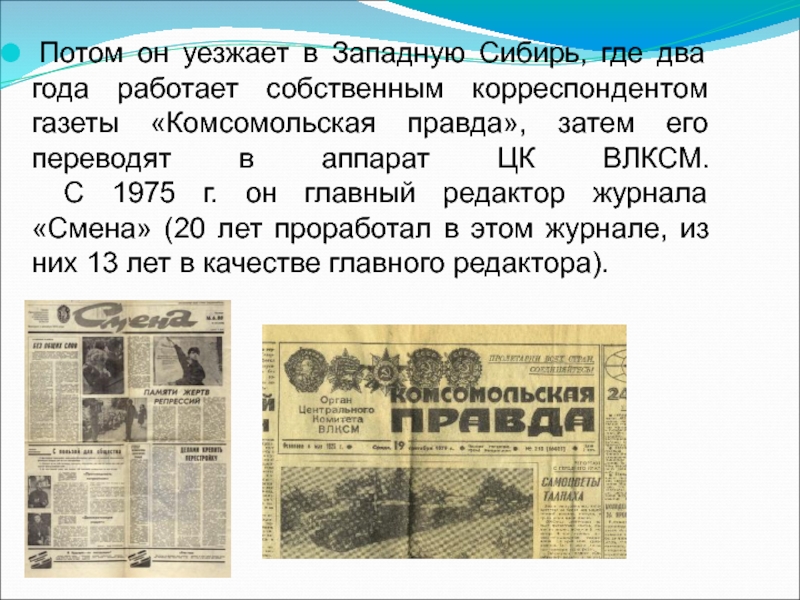 корреспондентом газеты «Комсомольская правда», затем его переводят в аппарат ЦК ВЛКСМ.