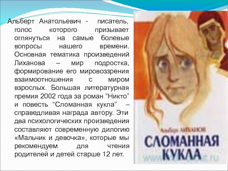 вопросы нашего времени. Основная тематика произведений Лиханова – мир подростка, формирование его мировоззрения взаимоотношения с миром взрослых. Большая литературная премия 2002 года за роман “Никто” и повесть “Сломанная кукла” – справедливая награда автору. Эти два психологических произведения составляют современную дилогию «Мальчик и девочка», которые мы рекомендуем для чтения родителей и детей старше 12 лет.